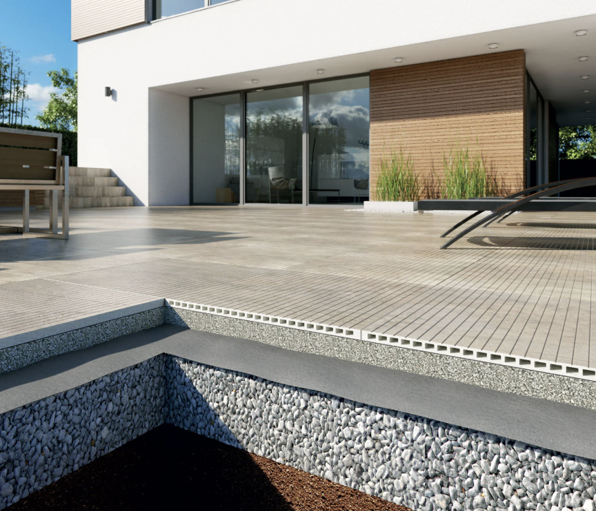 Witterungsbeständige Fliesenverlegung im Außenbereich, inklusive Abdichtung und Entwässerung.